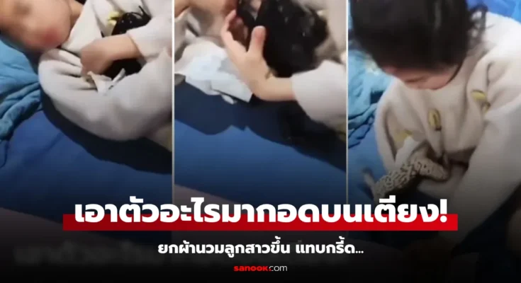 ในภาพที่ถูกแชร์ลงโลกออนไลน์จะเห็นได้ว่า หลังจากลูกสาวตื่นขึ้นมาก็ขยี้ตาอย่างงัวเงีย และยังคงกอดกบตัวใหญ่สีดำไว้แนบอก อีกทั้งยังเอาผ้านวมคลุมกลับมาเหมือนเดิม แล้วนอนต่อเหมือนกับว่าไม่มีเรื่องอะไรผิดปกติ