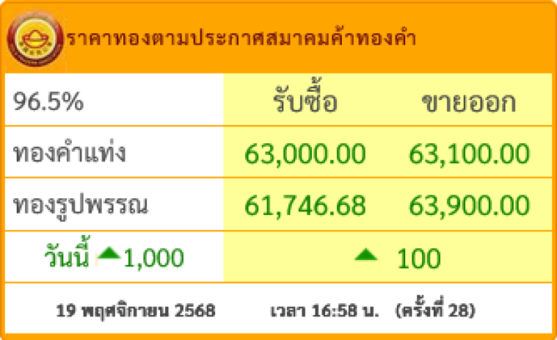ราคาทองคำ วันที่ 19 พฤศจิกายน 2568 เวลา 16:58 น. (ครั้งที่ 28)
