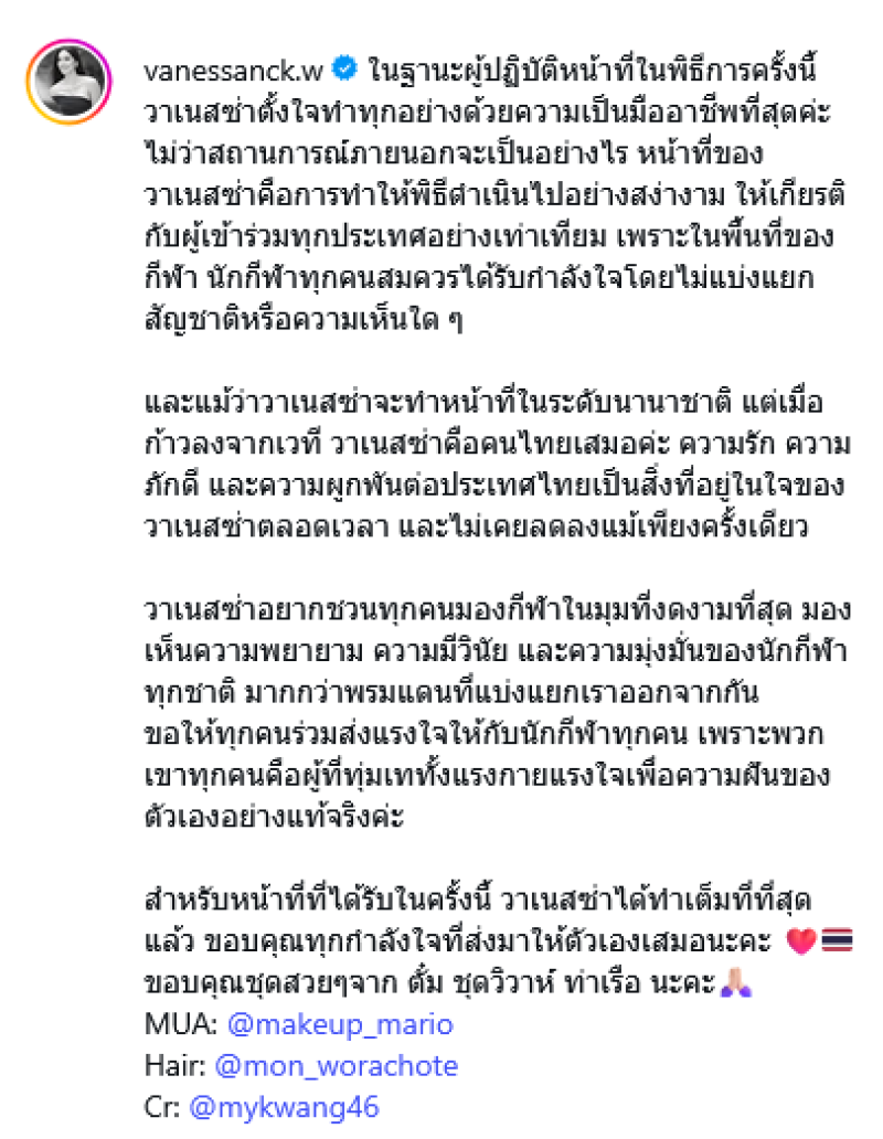 ในฐานะผู้ปฏิบัติหน้าที่ในพิธีการครั้งนี้ วาเนสซ่าตั้งใจทำทุกอย่างด้วยความเป็นมืออาชีพที่สุดค่ะ ไม่ว่าสถานการณ์ภายนอกจะเป็นอย่างไร หน้าที่ของวาเนสซ่าคือการทำให้พิธีดำเนินไปอย่างสง่างาม ให้เกียรติกับผู้เข้าร่วมทุกประเทศอย่างเท่าเทียม เพราะในพื้นที่ของกีฬา นักกีฬาทุกคนสมควรได้รับกำลังใจโดยไม่แบ่งแยกสัญชาติหรือความเห็นใดๆ