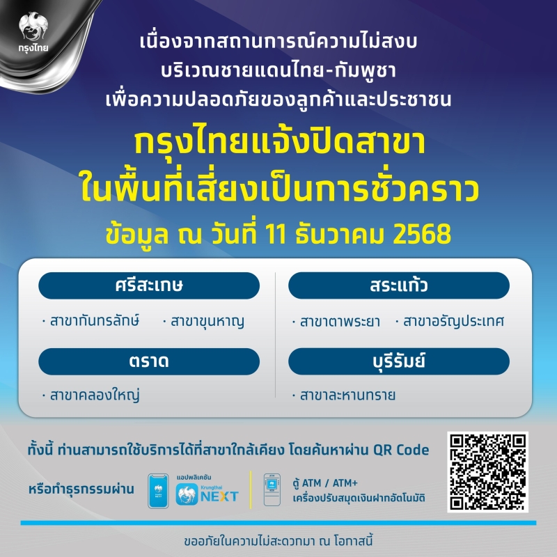 Newsธ.กรุงไทย ประกาศเตือนด่วน ถึงลูกค้า December 11, 2025 - by admin01 11 ธ.ค. 2568 เพจ Krungthai Care ได้ออกมาโพสต์ถึงลูกค้า โดยได้ระบุว่า เนื่องจากสถานการณ์ความไม่สงบ บริเวณชายแดนไทย-กัมพูชา กรุงไทยขอแจ้งปิดบริการสาขาในพื้นที่เสี่ยงเป็นการชั่วครา ข้อมูล ณ วันที่ 11 ธันวาคม 2568 ประกอบด้วยสาขา ดังนี้ 1. สาขากันทรลักษ์จ.ศรีสะเกษ 2. สาขาขุนหาญ จ.ศรีสะเกษ 3. สาขาตาพระยา จ.สระแก้ว 4. สาขาอรัญประเทศ จ.สระแก้ว 5. สาขาคลองใหญ่ จ.ตราด 6. สาขาละหานทราย จ.บุรีรัมย์