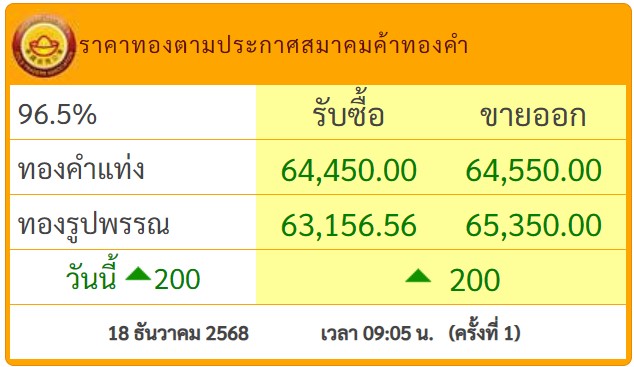 ราคาซื้อขายทองคําในประเทศชนิด 96.5% วันพฤหัสบดีที่ 18 ธันวาคม 2568 (ประกาศครั้งที่ 1)