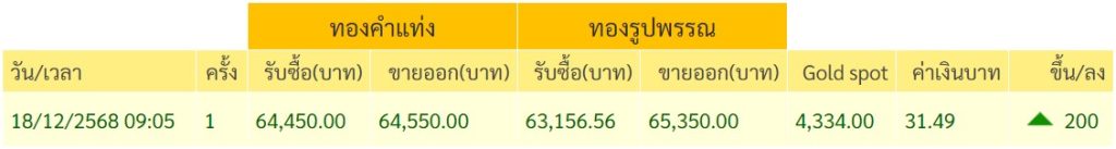 ราคาทองวันนี้ 18 ธันวาคม 2568 โดยสมาคมค้าทองคำ ประกาศราคาทองครั้งที่ 1 (เปิดตลาด) เมื่อเวลา 09.05 น. ปรับขึ้น 200 บาท ส่งผลให้ราคาทองล่าสุดอยู่ที่