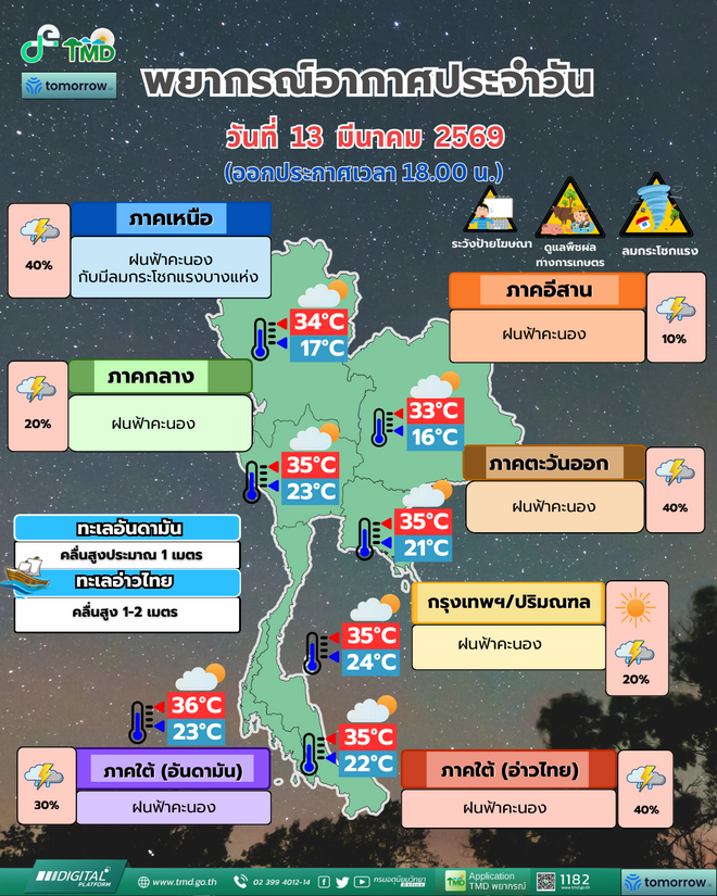 มีฝนฟ้าคะนอง ร้อยละ 20 ของพื้นที่ อุณหภูมิต่ำสุด 24-26 องศาเซลเซียส อุณหภูมิสูงสุด 33-35 องศาเซลเซียส ลมตะวันออกเฉียงเหนือ ความเร็ว 10-20 กม./ชม.