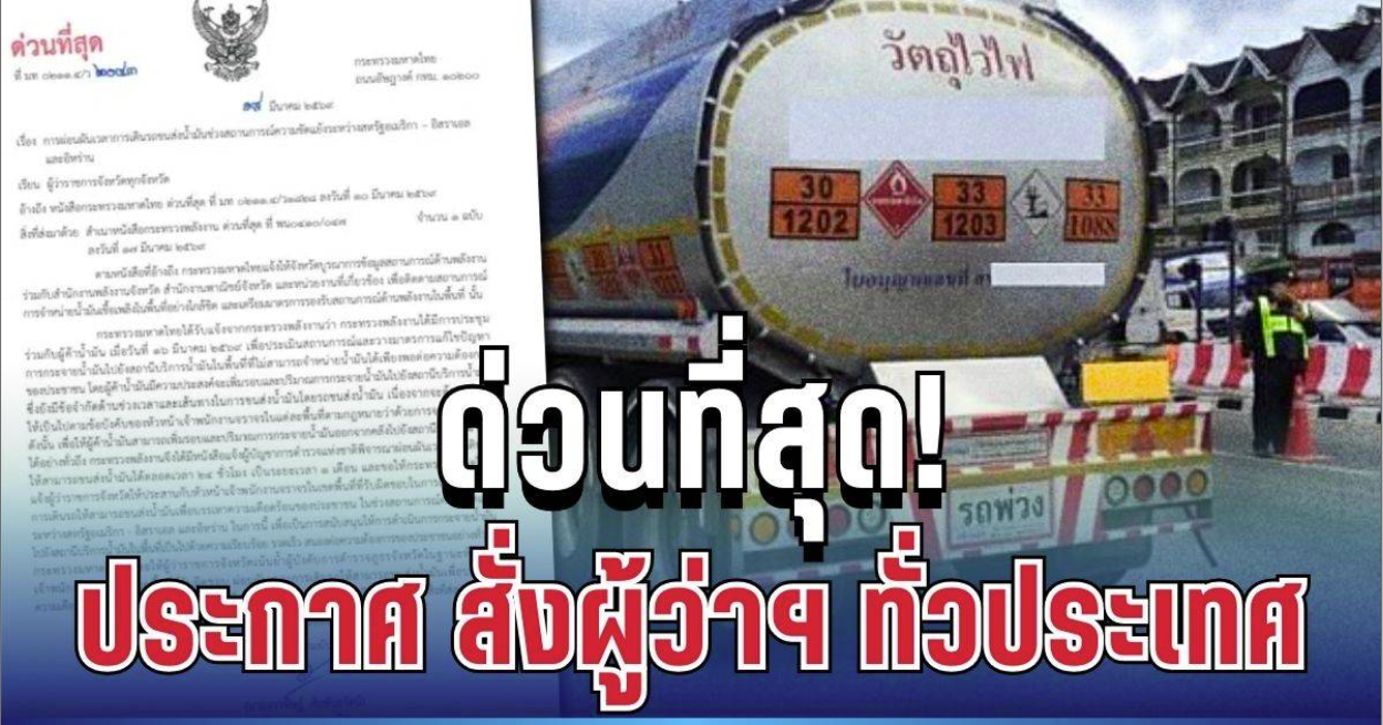 ปลัดกระทรวงมหาดไทยกล่าวว่า กระทรวงมหาดไทยได้รับแจ้งจากกระทรวงพลังงานถึงผลการประชุมร่วมกับกลุ่มผู้ค้าน้ำมัน เมื่อวันที่ 16 มีนาคม 2569 เพื่อประเมินสถานการณ์และวางมาตรการแก้ไขปัญหาการกระจายน้ำมันไปยังสถานีบริการ ซึ่งอาจมีปริมาณไม่เพียงพอต่อความต้องการ โดยกลุ่มผู้ค้าน้ำมันมีความประสงค์เพิ่มรอบและปริมาณการขนส่งน้ำมันจากคลังไปยังสถานีบริการ