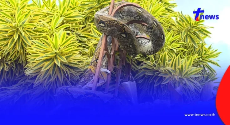 ชาวบ้านแตกตื่นกลางวันแสก ๆ หลังพบงูเหลือมตัวใหญ่เลื้อยขึ้นไปพันอยู่บนรั้วหน้าบ้าน เจ้าหน้าที่ต้องเร่งเข้าช่วยเหลือ ท่ามกลางความลุ้นระทึกของผู้เห็นเหตุการณ์